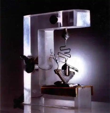 这个电路是一个带有RC反馈的单晶体管振荡器,整个是用胶水粘在玻璃载片上的,看上去非常简陋。电路的器件,则是用零乱的细线相连。