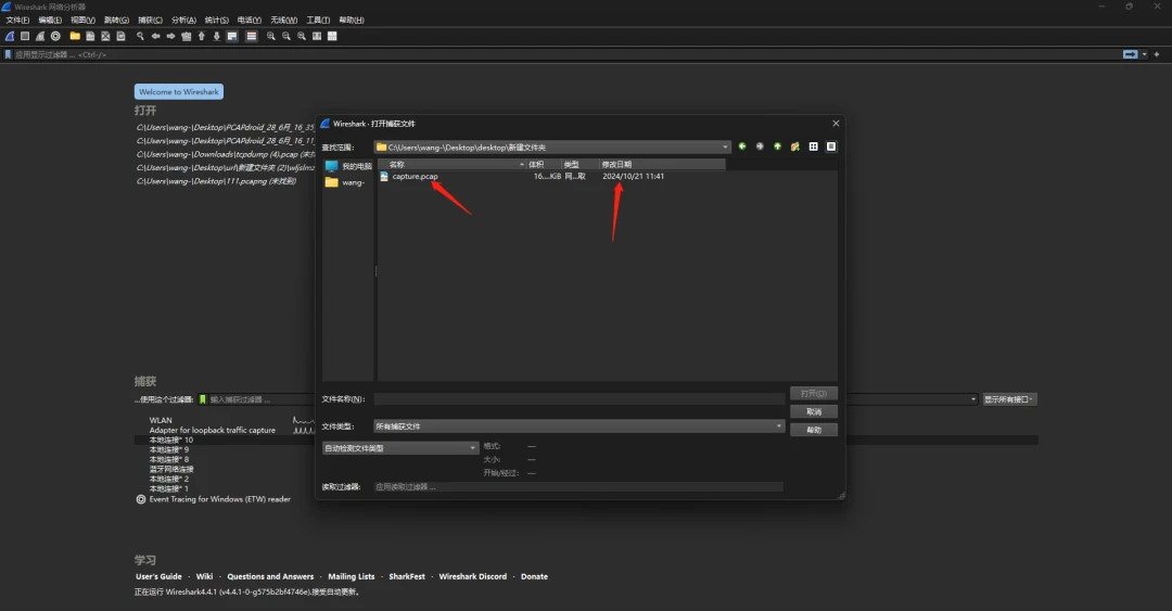 保存的文件可以在 Wireshark 中打开,借助 Wireshark 强大的图形界面进行更直观的分析和解码。尤其是在需要对复杂协议(如 SSL、HTTP、DNS)进行深度分析时,Wireshark 的可视化功能可以极大地提高工作效率。