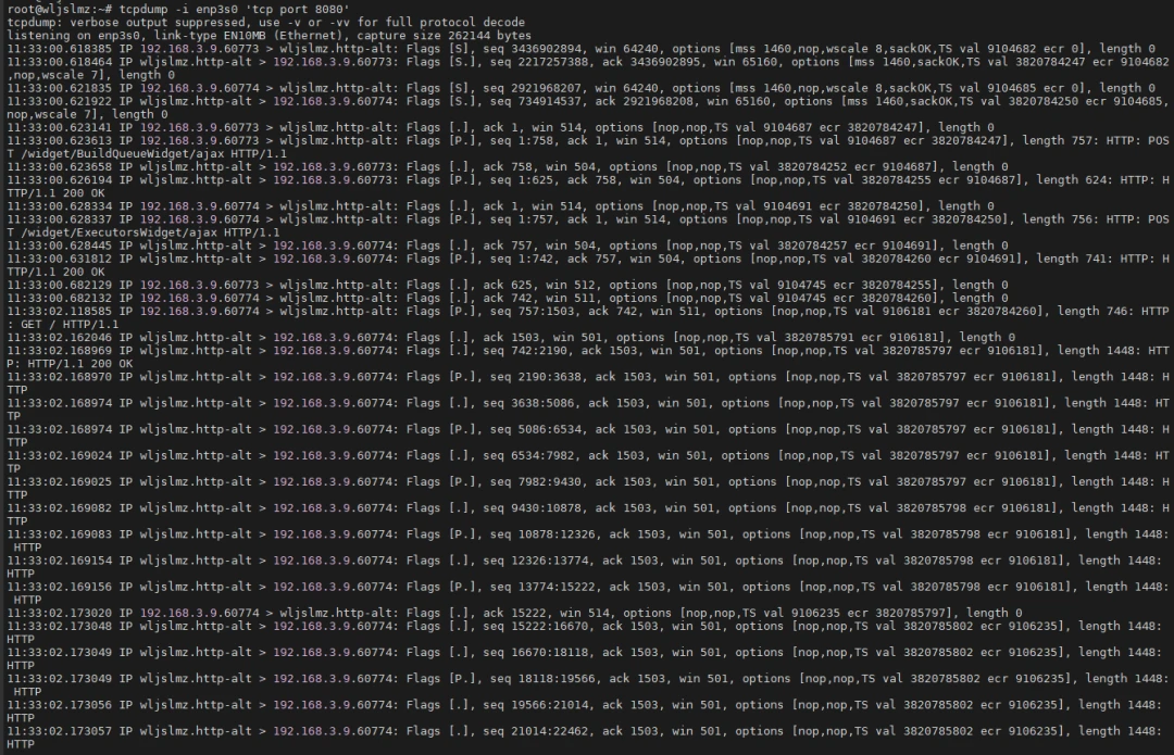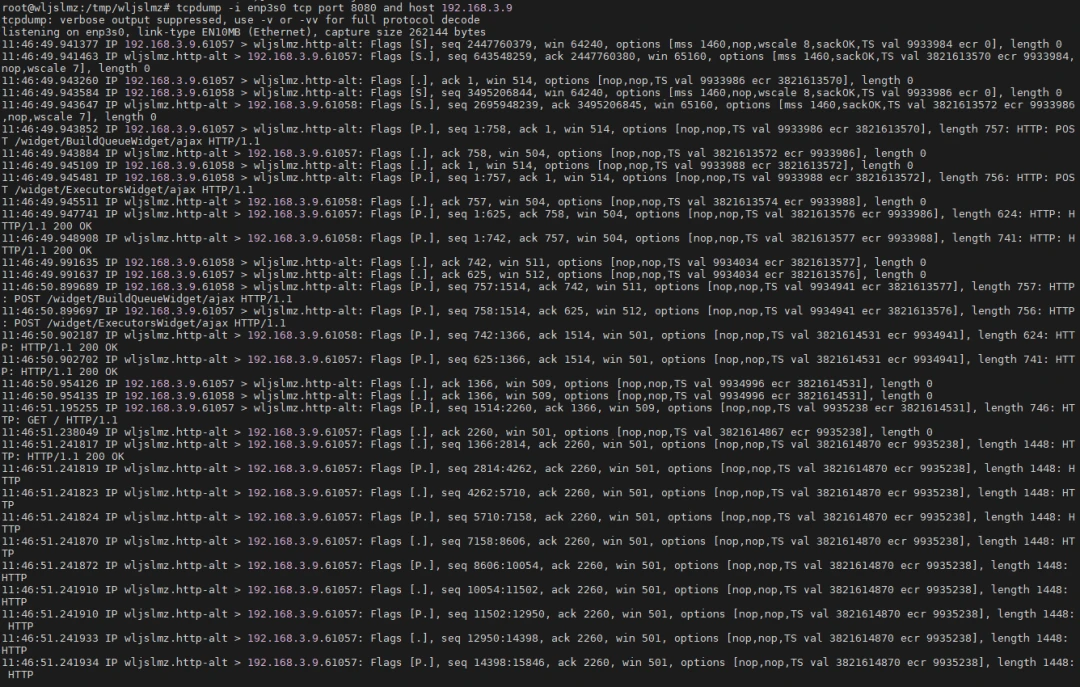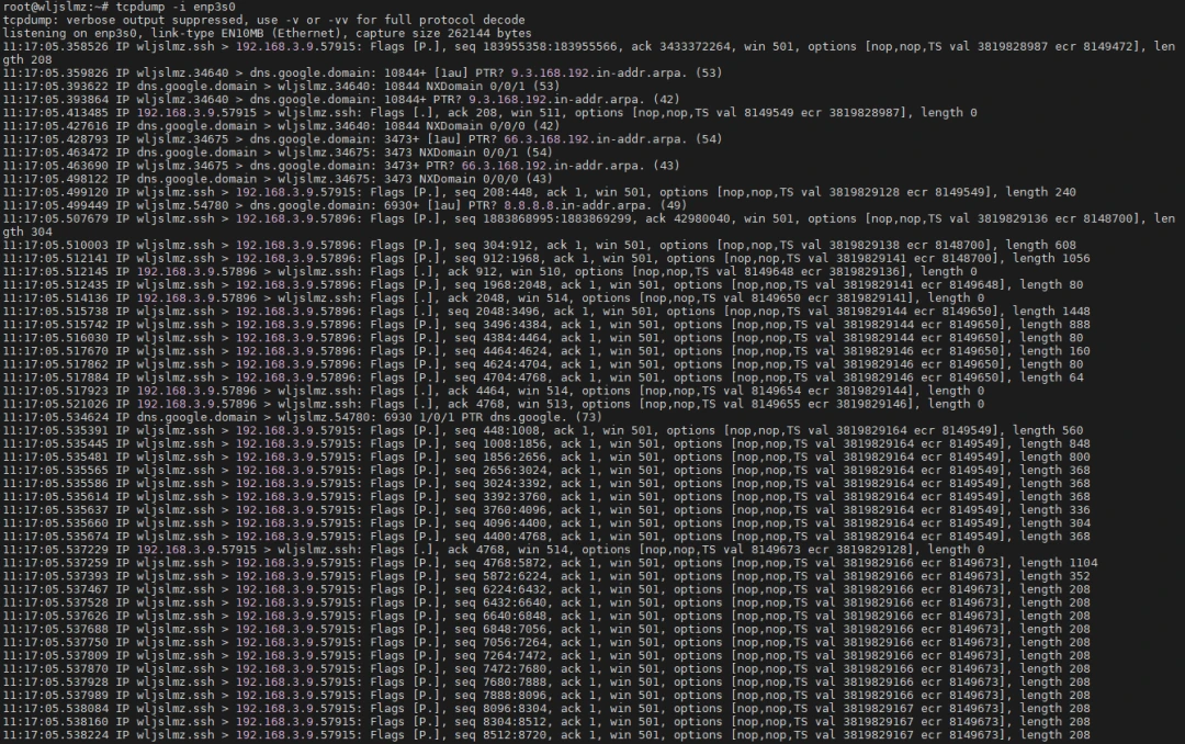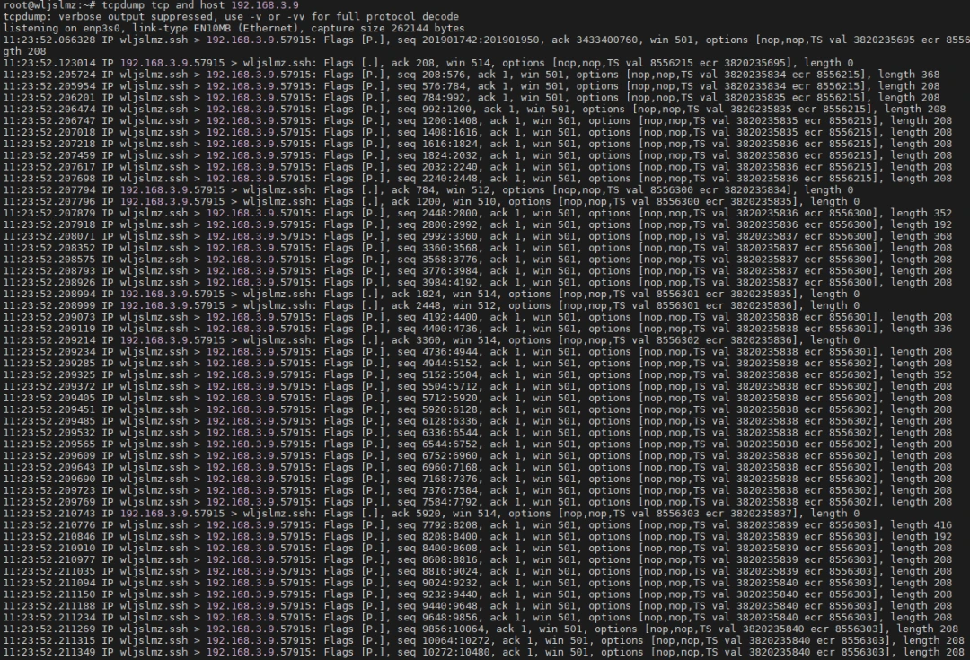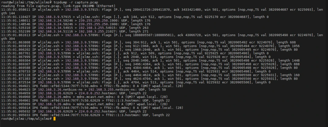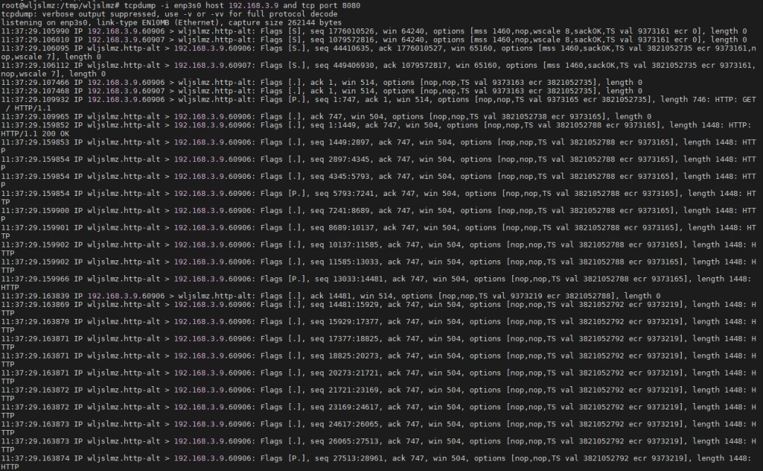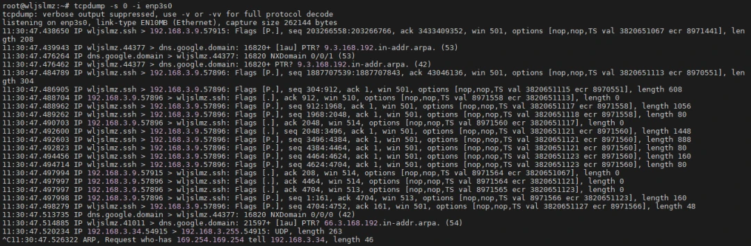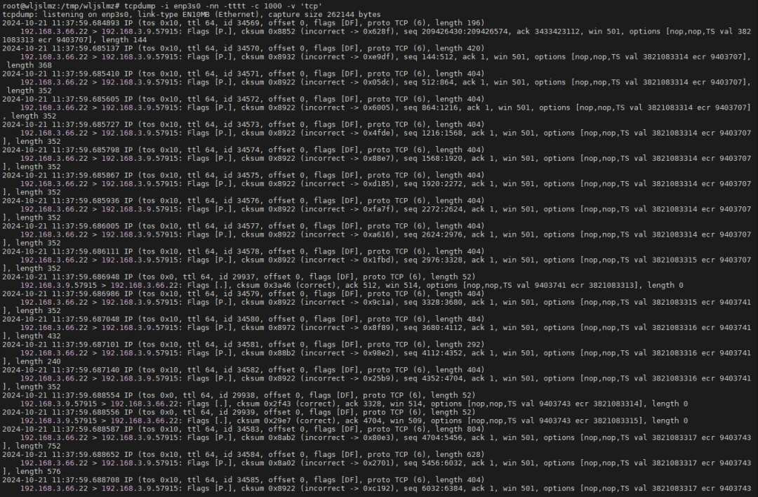 此外,TCPdump 还可以结合 Linux 自带的 工具,分析系统的网络连接状态。通过同时使用 抓包和 查看系统当前连接,能够更直观地了解当前网络带宽的使用情况。