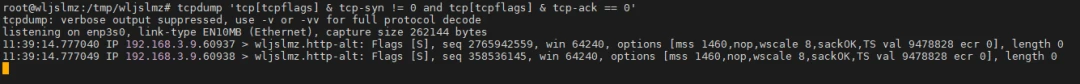 例如,以下命令用于捕获常见的 SYN Flood 攻击(大量发送 SYN 报文但不继续完成握手的攻击):