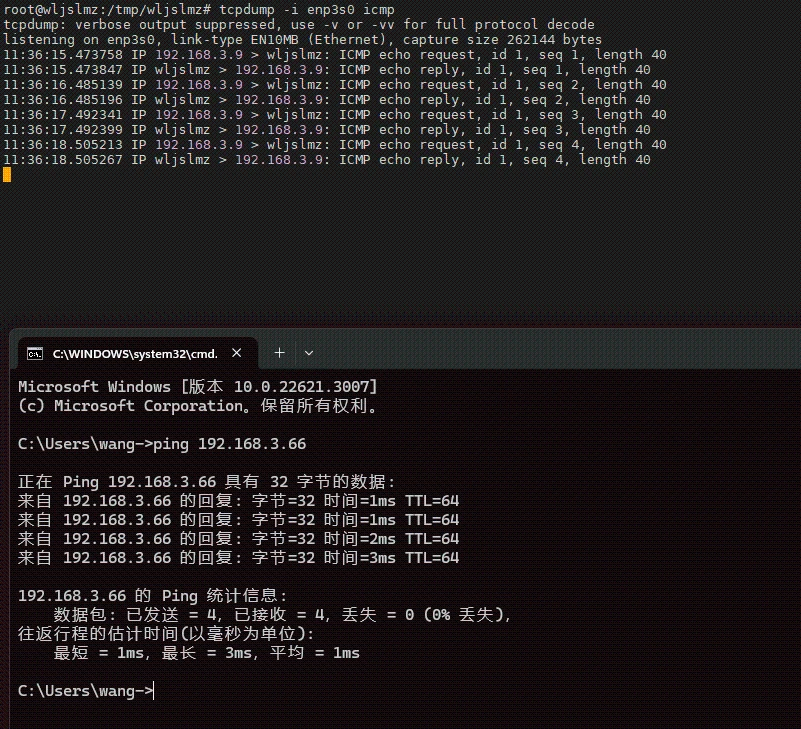例如,以下命令用于抓取所有 ping(ICMP 回显请求与应答)和响应的数据包: