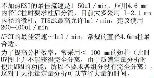 3.流动相:流动相中尽量加易挥发的盐,尽量不要加表面活性剂之类的,容易离子抑制,如果遇到离子抑制,可以试试把你的样品峰往后推推或者改变提取方法,也可以试试用APCI源。如果你的液相是低压混合的,尽量不要跑梯度,那样很费时间,如果没办法,一针又要走很长时间的话,可以考虑切换,只测样品出峰前后的那段时间,这样可以保护质谱。但是如果你用粗柱子,较高流速的也可以考虑跑梯度,如API4000,但要尽量减小死体积。
