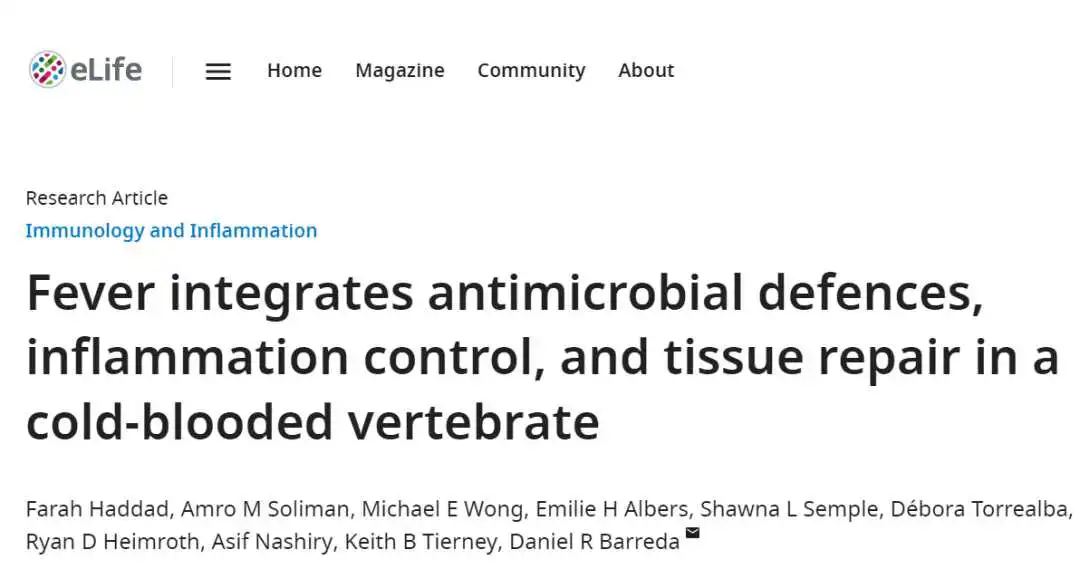 2. Haddad F, et al. Fever integrates antimicrobial defences, inflammation control, and tissue repair in a cold-blooded vertebrate. Elife. 2023 Mar 14;12:e83644. doi: 10.7554/eLife.83644.