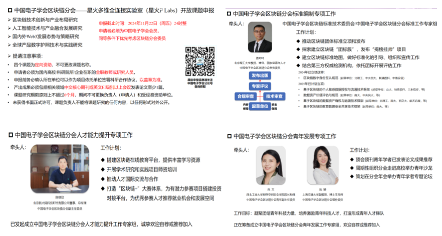 大会发布了中国电子学会区块链分会与星火多维全连接实验室(星火i² Labs)联合设立的4个开放课题,包括:区块链技术创新与产业布局研究、人工智能技术与产业融合发展研究、国内外Web3发展态势与策略研究、全球产品数字护照技术与实践研究,面向国内高校、科研院所、企业的相关研究人员开放申报,并设有课题资助经费。