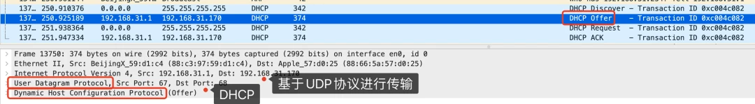 另外,通过抓包,我们可以发现DHCP是应用层的协议,基于传输层UDP协议进行数据传输。