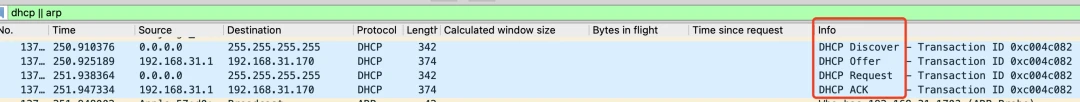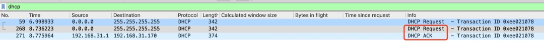 我们可以看到蓝色的四个数据包,分别对应上面提到的四个DHCP阶段。