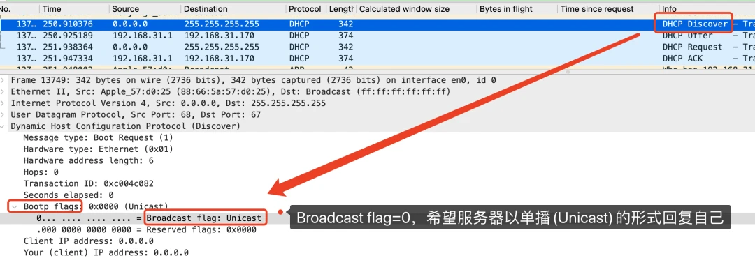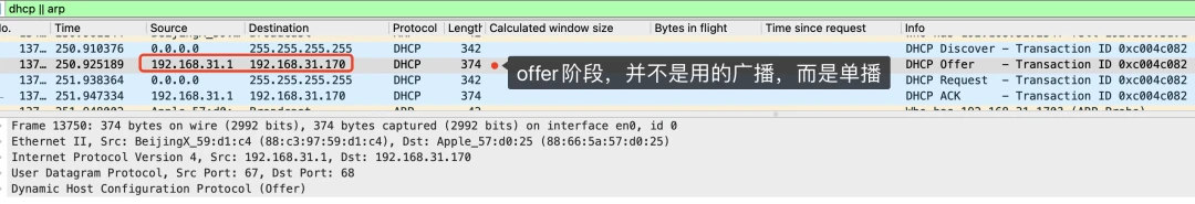 另外一个小细节不知道大家注意到没,上面在提到 DHCP Offer 阶段时,提到的是DHCP服务器会使用广播的形式回复。但抓个包下来却发现并不是广播,而是单播。