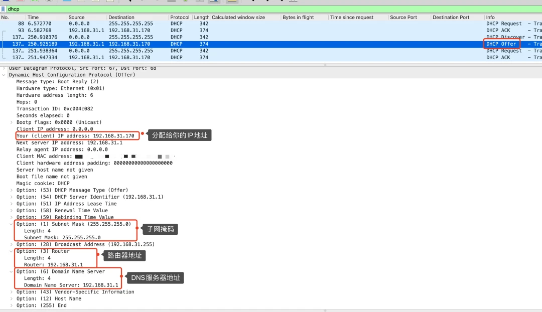 其中第二阶段中的DHCP Offer里会返回给我们需要的IP、子网掩码、路由器地址以及DNS服务器地址。