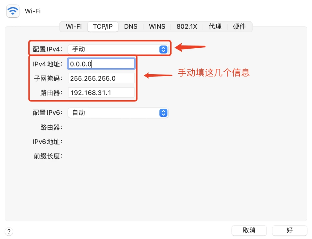 第一种是,自己手动在电脑里配。像下图那样,是macOS的一个截图,在选择手动配置之后,除了IP地址还需要配上子网掩码和路由器的地址。