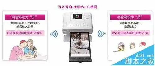 2、Wi-Fi®打印:在无线打印方面,SELPHY CP1200新设计了Wi-Fi®按钮,轻触一下即可转到无线连接设置界面,可选择开启或关闭打印机的Wi-Fi®密码,通过直观操作提示即可完成Wi-Fi®设置。