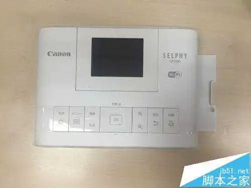4、SELPHY CP1200机身的外观,上面有几个功能键左边第一个是电源按钮然后是设置选项、编辑和WiFi、上下左右按钮和确定、放大缩小按钮、返回按钮、打印按钮。