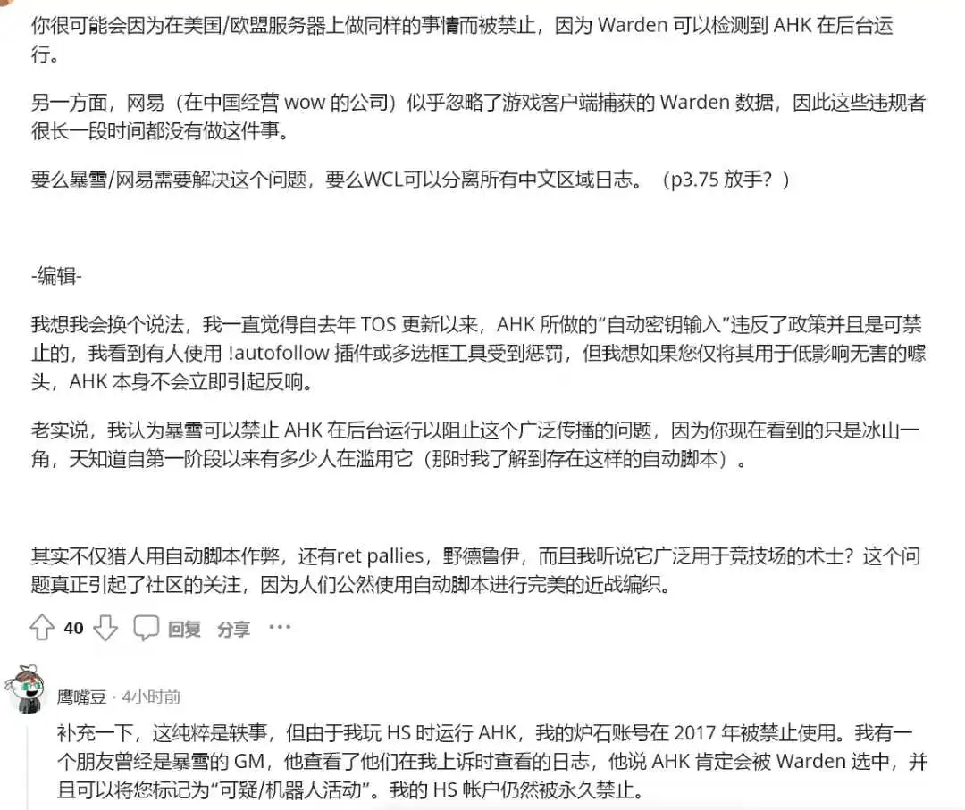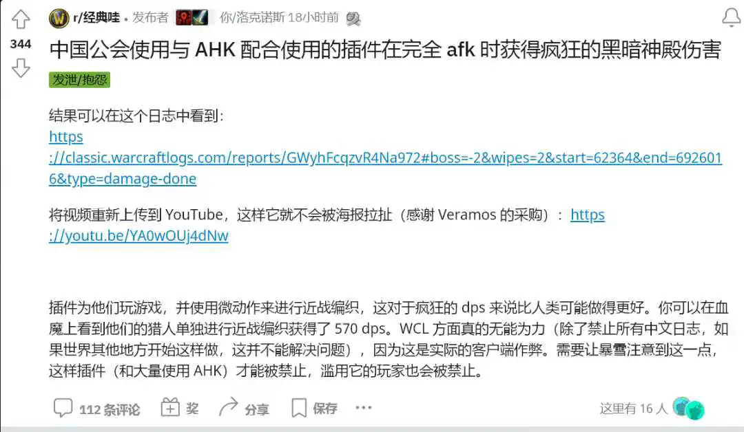 你可以在血魔上看到他们的猎人近战获得了 570 dps。WCL 方面真的无能为力(除了禁止所有中文日志,如果世界其他地方开始这样做,这并不能解决问题),因为这是实际的作弊。需要让暴雪注意到这一点,这样插件(和大量使用 AHK)才能被禁止,滥用它的玩家也会被禁止。