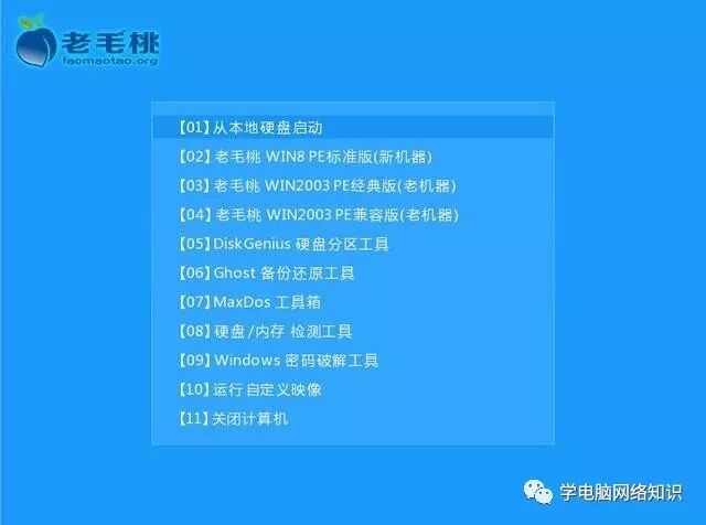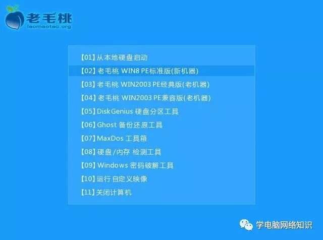 将制作好的启动u盘插入电脑usb接口,开启电脑,稍等即可进入到老毛桃主菜单页面,将光标移至“【02】老毛桃WIN8 PE标准版(新机器)”,按回车键确认。如果进入失败,亲选择第3项“老毛桃WIN2003 PE经典版”,如上图所示。