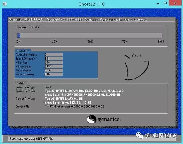 如上图,熟悉的Ghost安装界面出来了,接下来你要做的就是耐心等待,整个安装过程一般都是无人值守安装。安装过程中,千万不要断电或者随意重启电脑。遇到黑屏等情况,请耐心等待,一般都会正确安装。
