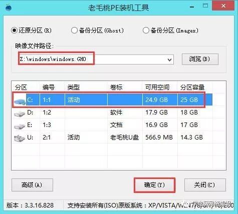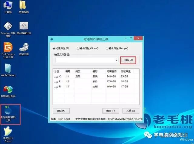 成功进入pe系统后,打开桌面上的“”老毛桃PE装机工具“”。点击“浏览”按钮,如上图所示,找到U盘,然后选择你复制进U盘的Ghosr镜像。