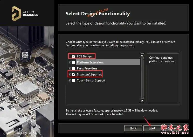 4、安装功能选择对话框,选择需要安装的组件功能。一般选择安装PCB Design、ImportersExporters 两项即可
