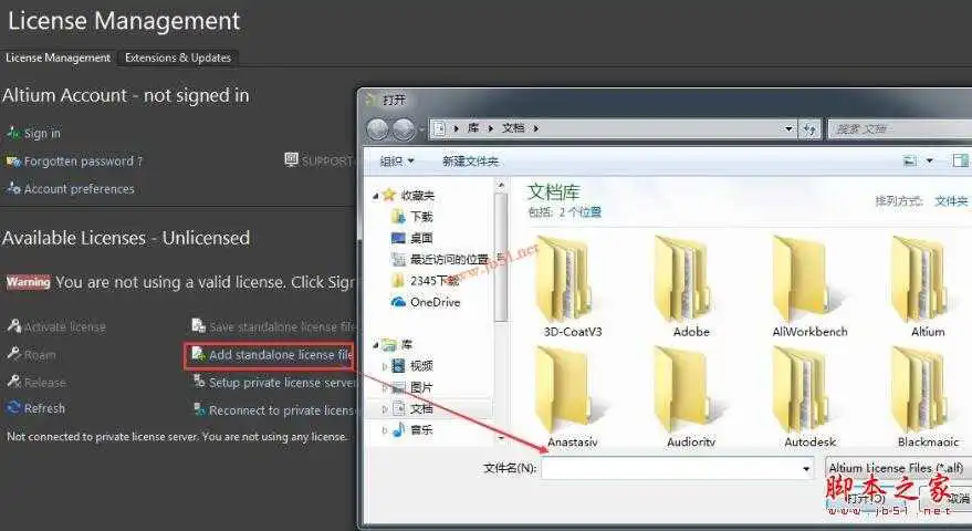 11、找到 Add standalone license file,弹出加载 license 文件对话框, 加载提供和谐 Licenses 文件Altium Designer 20.alf
