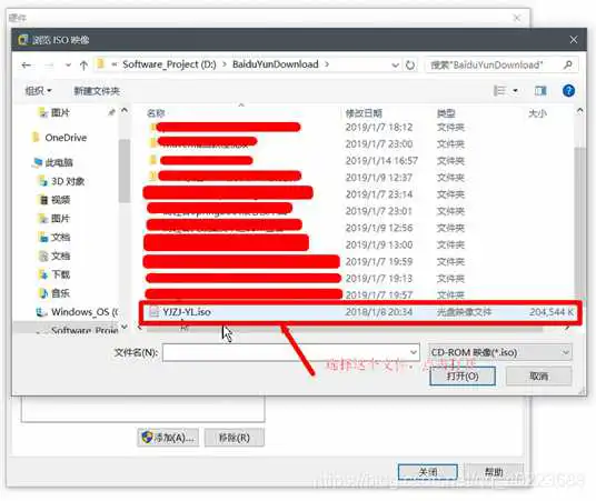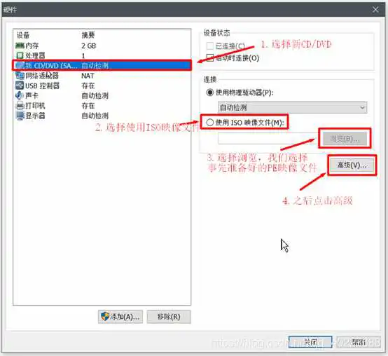 1.选择新CD/DVD,2.选择使用ISO映像文件,3.选择浏览,选择我们在第一步提取出来的PE文件夹下的ISO文件
