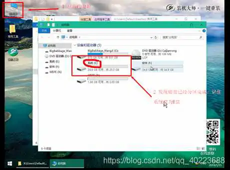 3.分区完成,我们关闭该分区工具窗口。选择启动桌面上的【此电脑】,发现磁盘已经完成分区,此图中系统盘为E盘,不同的情况,不同对待,