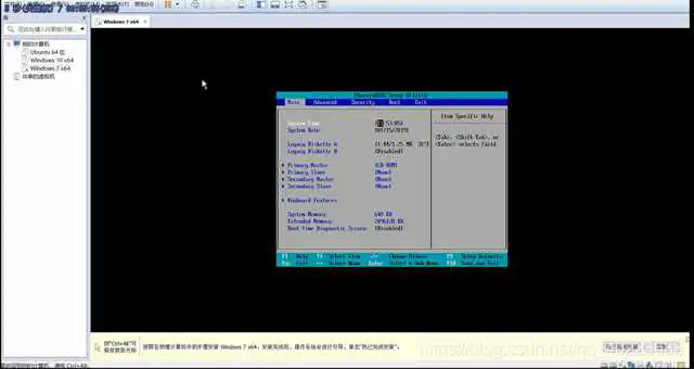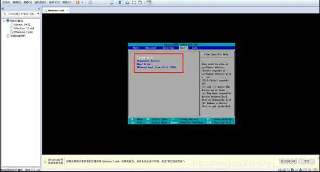 1.然后我们选择我们刚刚创建好Windows 7 x64,右击,选择电源-->打开电源时进入固件;然后将进入win系统的BOIS界面,我们需要将CD/DVD设置为首启动盘