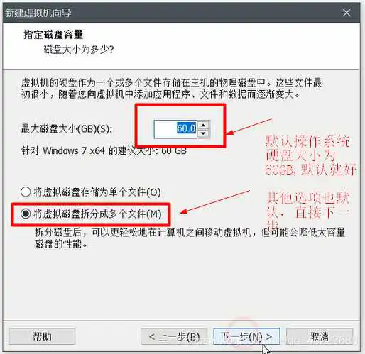 七、选择操作系统磁盘大小,默认为60GB(注意:此处需占用你真实电脑内存60GB,所以在前面声明需有200GB内存硬盘),此处默认就好,直接下一步