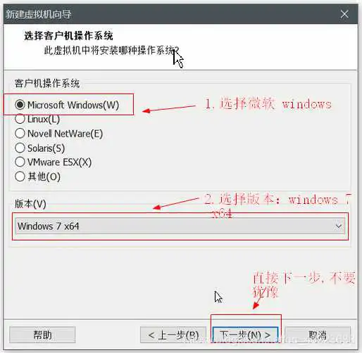 五、这里我们将选择操作系统版本:我们选择微软的Windows,版本将选择Windows7 64位,然后直接下一步