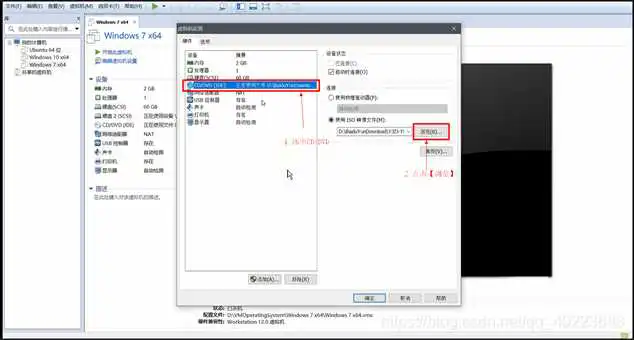 进行镜像文件切换:点击CD/DVD,然后点击浏览,选中我们电脑上存放的windows7镜像文件,点击【打开】,然后【确定】