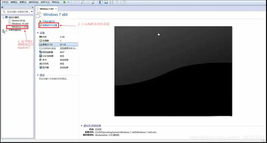 十一、在VMware软件左边选择我们刚刚创建的Windows 7 x64,然后点击旁边的编辑虚拟机设置