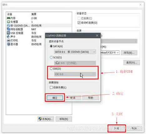 4.然后选择IDE虚拟设备节点,确定,并关闭
