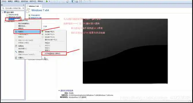 7.这个时候我们需要将虚拟机确认关闭(右击操作系统名——>电源——>关闭客户机),然后将虚拟机设置里的pe镜像文件改成win7镜像文件