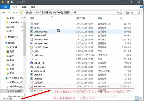 一、首先找到我们事先准备好的Win7镜像文件,我们右击它,选择装载,便进入了该镜像文件夹中,然后,我们选择PE文件夹中的YJZJ-YL.iso文件(注意:可能不同的镜像文件,名字不同,但是后缀必须是.iso的)复制到一个固定的文件夹,因为我们待会得使用它。