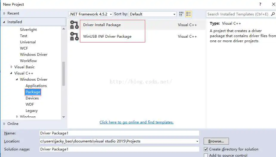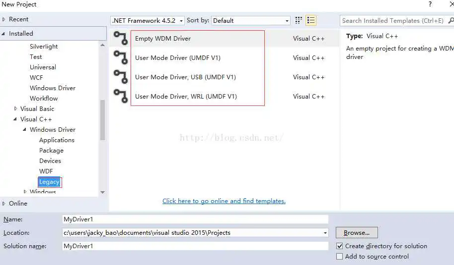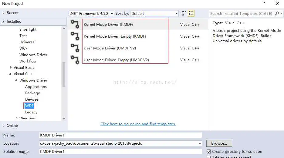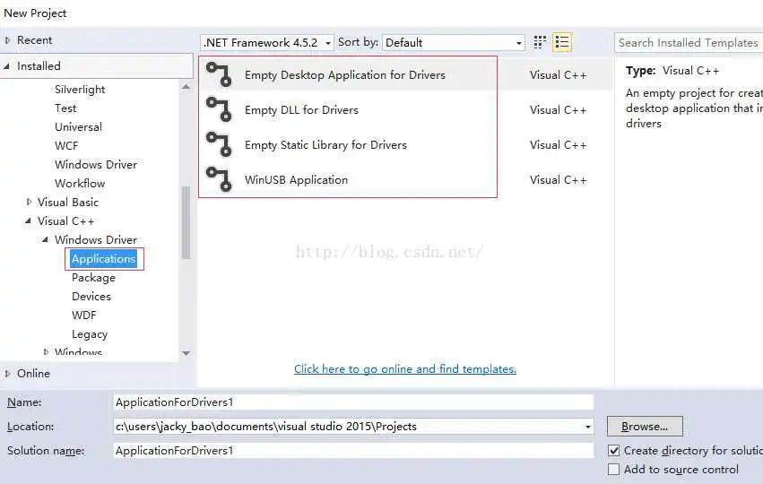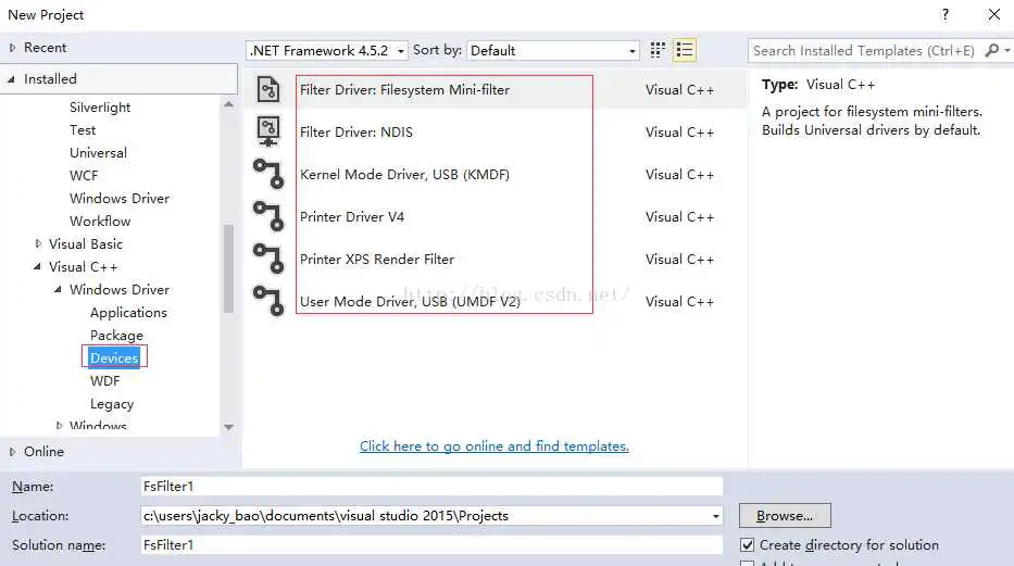 首先会下载wdksetup.exe,然后双击此exe进行安装,安装成功后打开vs2015,新建一个工程,可以看到可供创建的驱动程序模板有很多。