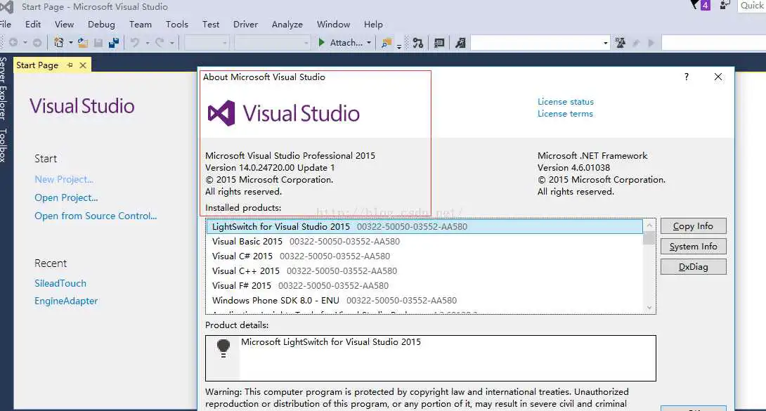 在C:Program Files(x86) Microsoft Visual Studio 14.0Common7IDE下(笔者默认是安装在系统盘下的)双击devenv.exe启动vs2015,点击菜单栏Help->About Microsoft Visual Studio,可看到vs2015版本信息,如笔者安装后查看如下: