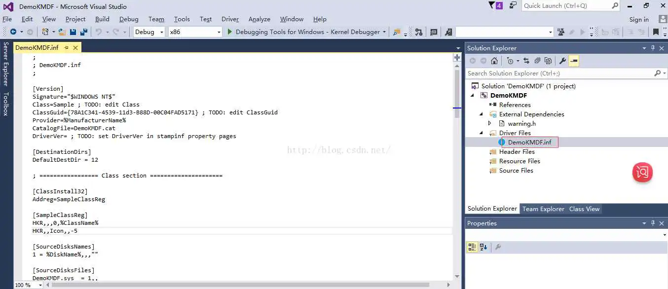 4. 可以使用WDF10进行驱动程序开发了,如下为笔者新建一个空的KMDF驱动程序(只包含一个inf文件)