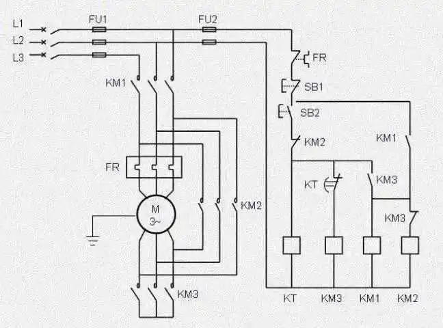 控制逻辑解析:启动顺序,按下SB2、KM1、KM3、KT吸合,电动机M进入星型运行状态。同时KT进入延时断开状态,时间到达后KT断开KM 3,KM3长闭触点复位后,KM2得电、KM2线圈吸合后,进行了端子合并。电动机M由星型转为三角形运行。