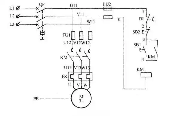 主回路(一次回路)常见符号:L表示电源;QF断路器;U、V、W负载相序;FU保险;FR热继电器;M电动机;PE接地保护。