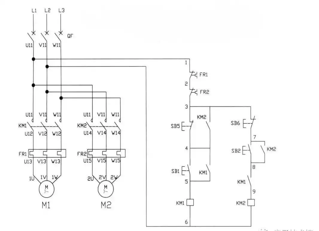 控制逻辑解析:启动顺序,按下SB1、KM1线圈得电、KM1常开变为常闭、KM1接触器自锁吸合,M1电动机开始运转。按下SB2、电源通过KM1常开转常闭点后、KM2得电,KM常开转常闭,KM2接触器吸合,M2电动机开始运转。