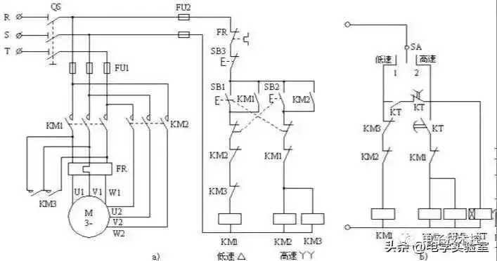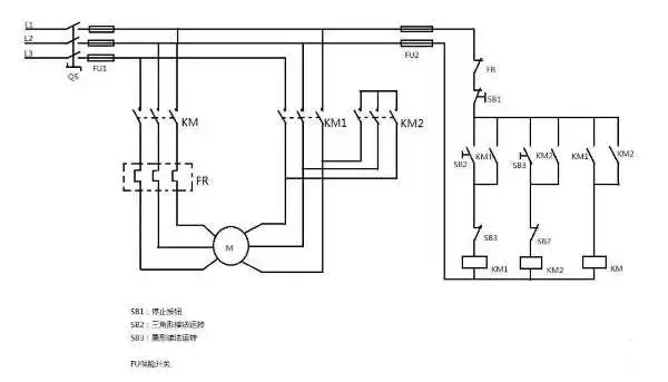功能作用:手动双速控制,通过手动控制星型和三角型运行实现不同的运行速度。一般有3个接触器、1个停止按钮、1个低速按钮、1个高速按钮组成。常用多速台钻、多速风机、车床电路中。