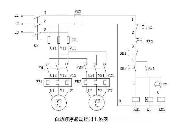 功能作用:自动顺序启动,指电动机M1启动后,通过自动延时控制,在延时条件满足时,电动机M2启动运行。一般有1个启动按钮、1个停止按钮、2个接触器、1个时间继电器组成。常用于自动化生产线、大型机械联动控制、数控车床等领域。