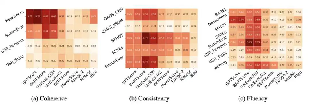 对于 coherence,几个基于 n-gram 的方法几乎无法识别出 perturbation。原因也很清楚,因为我们用于 coherence 的 perturb 方法是对句子进行打乱,并不会影响 n-gram 的匹配,因此 BLUE 等 metric 将对 perturb 前后的文本给出相同的分数。