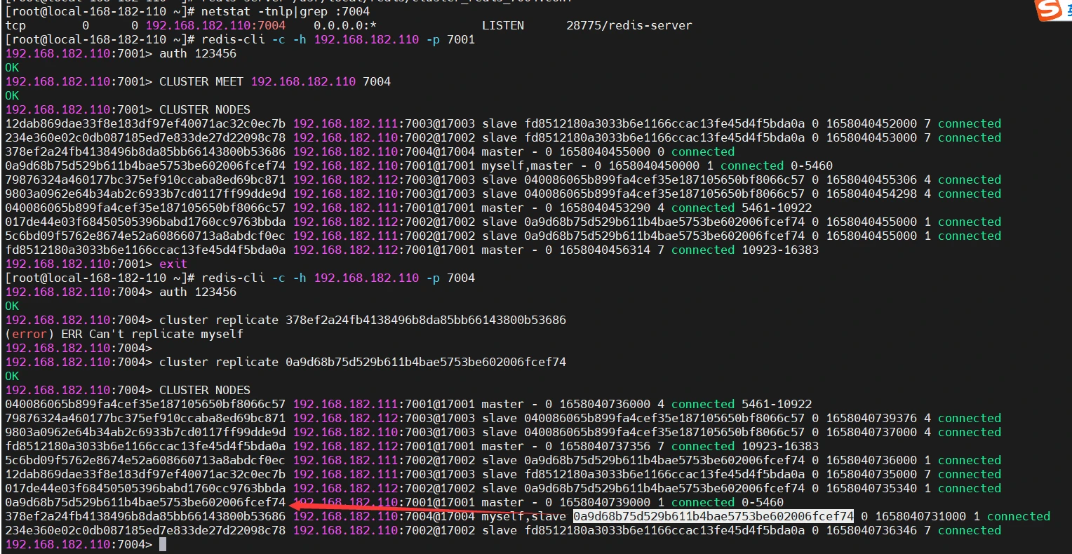 将新增的192.168.182.110:7004节点身份改为192.168.182.130:7001的slave
