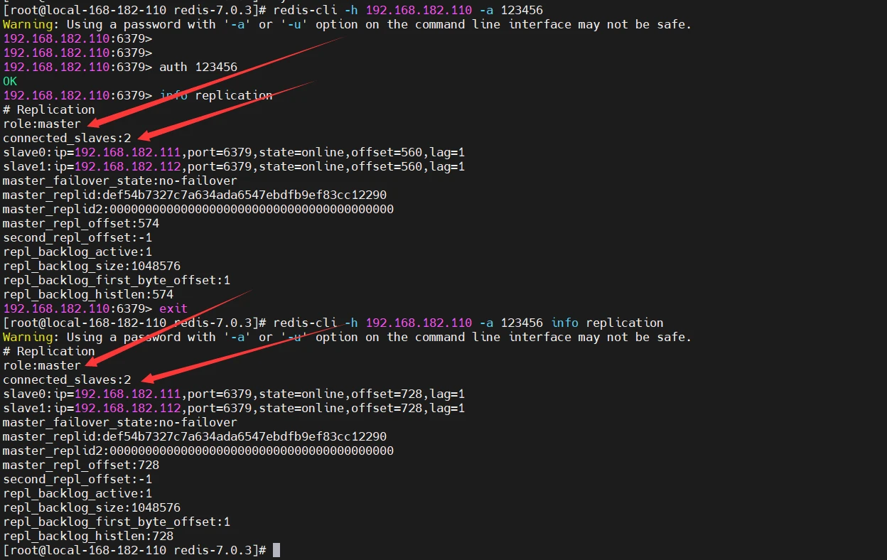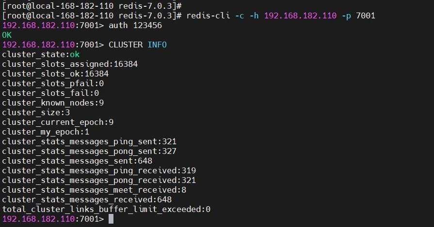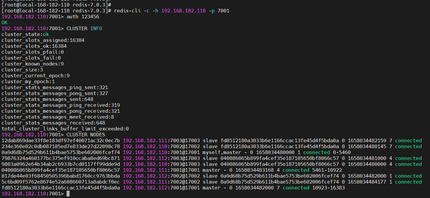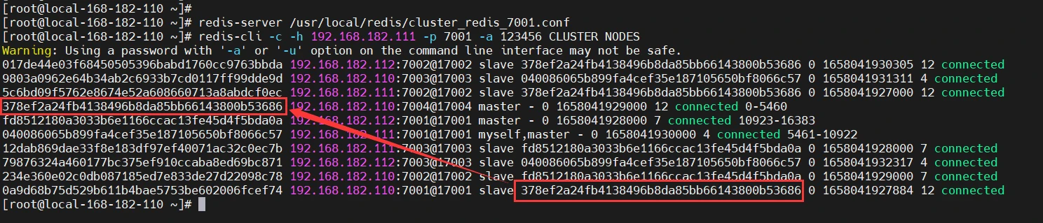可以看到,192.168.182.110:7001节点启动后为slave节点,并且是192.168.182.110:7004的slave节点。即master节点如果挂掉,它的slave节点变为新master节点继续对外提供服务,而原来的master节点如果重启,则变为新master节点的slave节点。