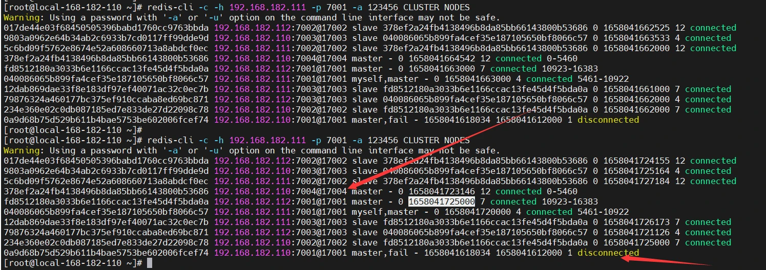 对应192.168.182.110:7001的一行可以看到,master fail,状态为disconnected;而对应192.168.182.110:7004的一行,slave已经变成master。