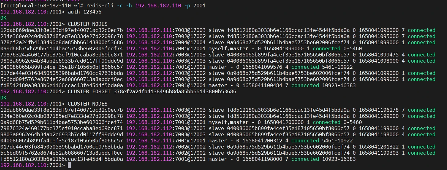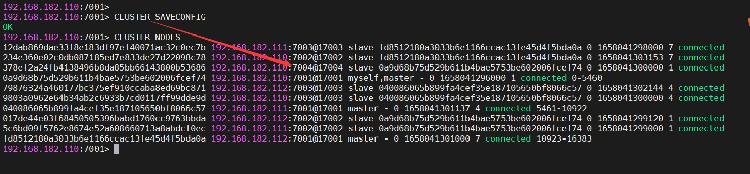 可以看到,之前删除的节点又恢复了,这是因为对应的配置文件没有删除,执行CLUSTER SAVECONFIG恢复。