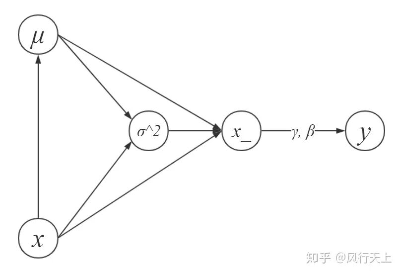 再来用反向传播求梯度。我们先画出BN的计算图,由于节点的文本不支持Tex,其中x_即为