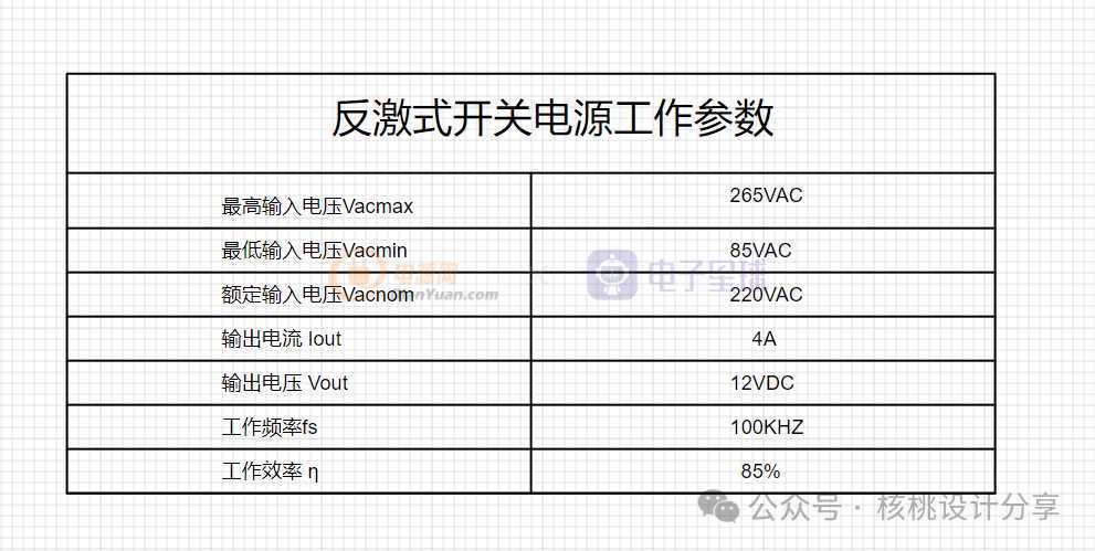 我们还是按照上一章中的开关电源设计参数来计算输入电容,如下表格1: