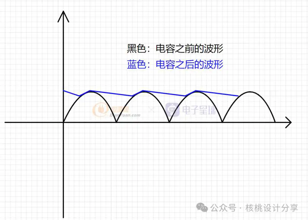 首先我们要知道是输入电容的重要性,AC220V经过整流桥之后想要平滑的直流电,必须要加输入电容,常用电解电容。波形处理如下所示: