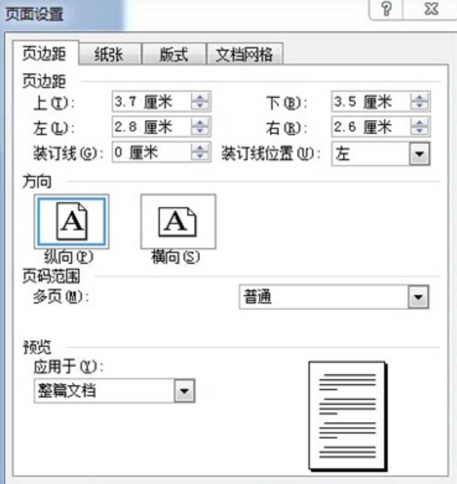 1.选择“文件”——“页面设置”选择“页边距”附签,上:3.7厘米,下:3.5厘米,左:2.8厘米,右:2.6厘米。