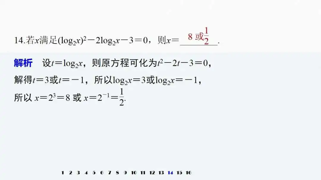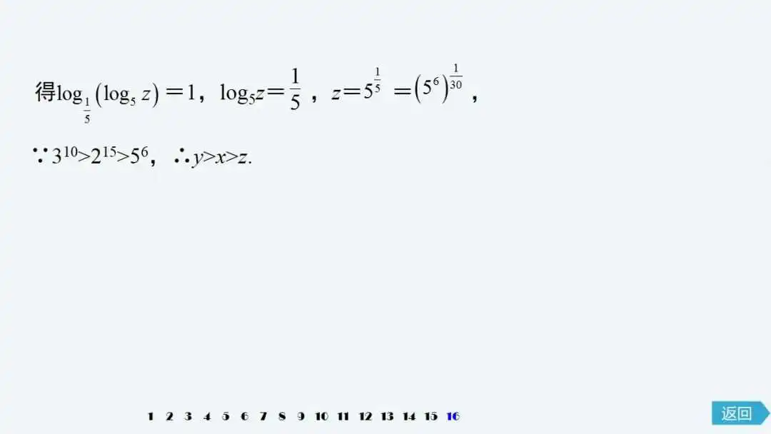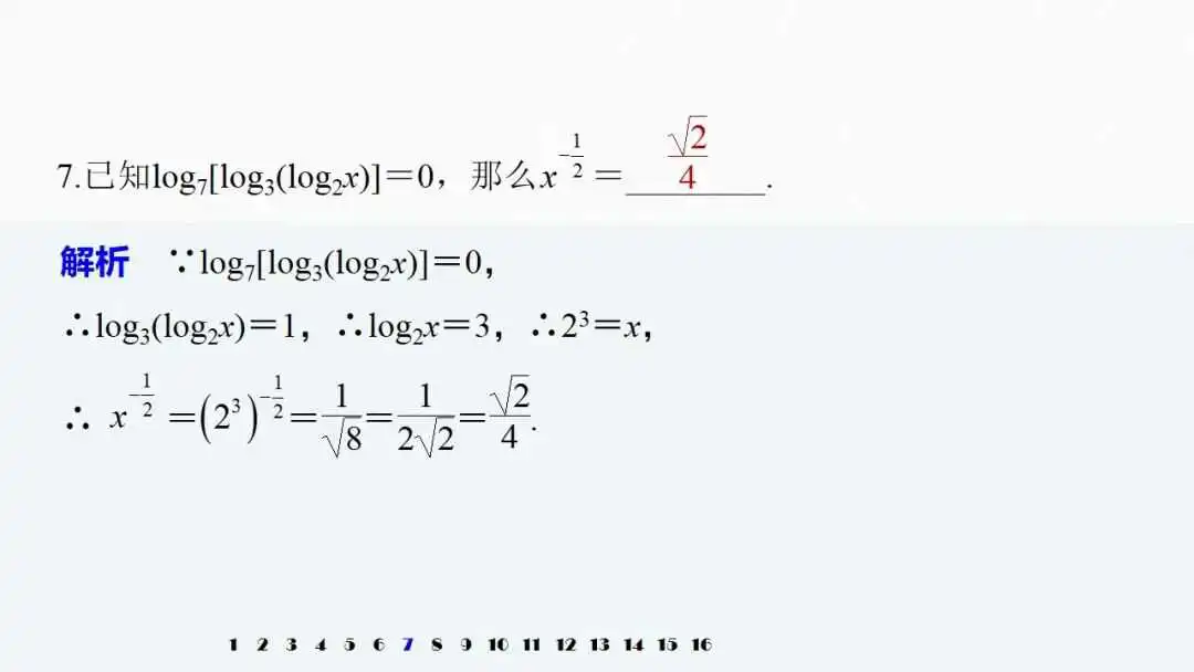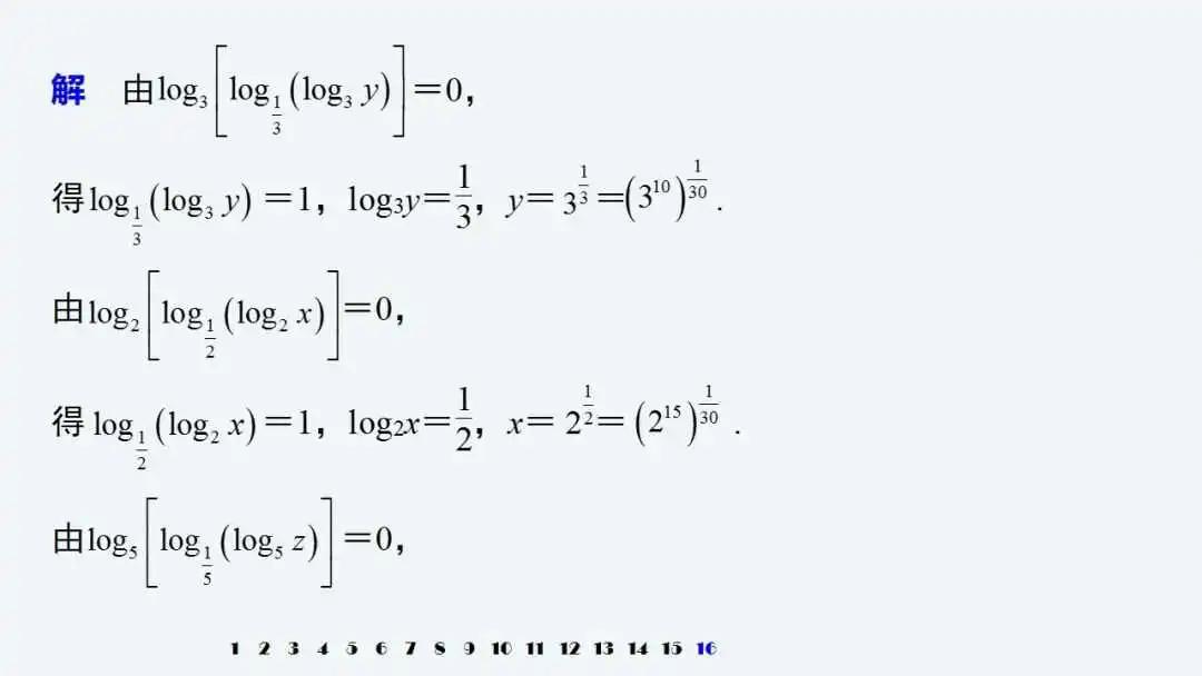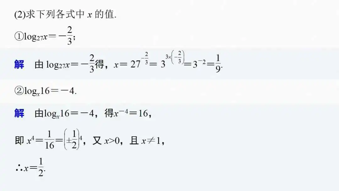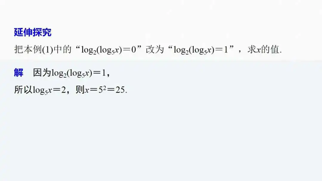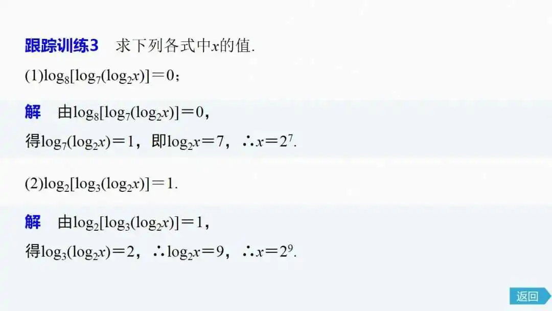 (2)已知多重对数式的值,求变量值,应从外到内求,逐步脱去“log ”后再求解.