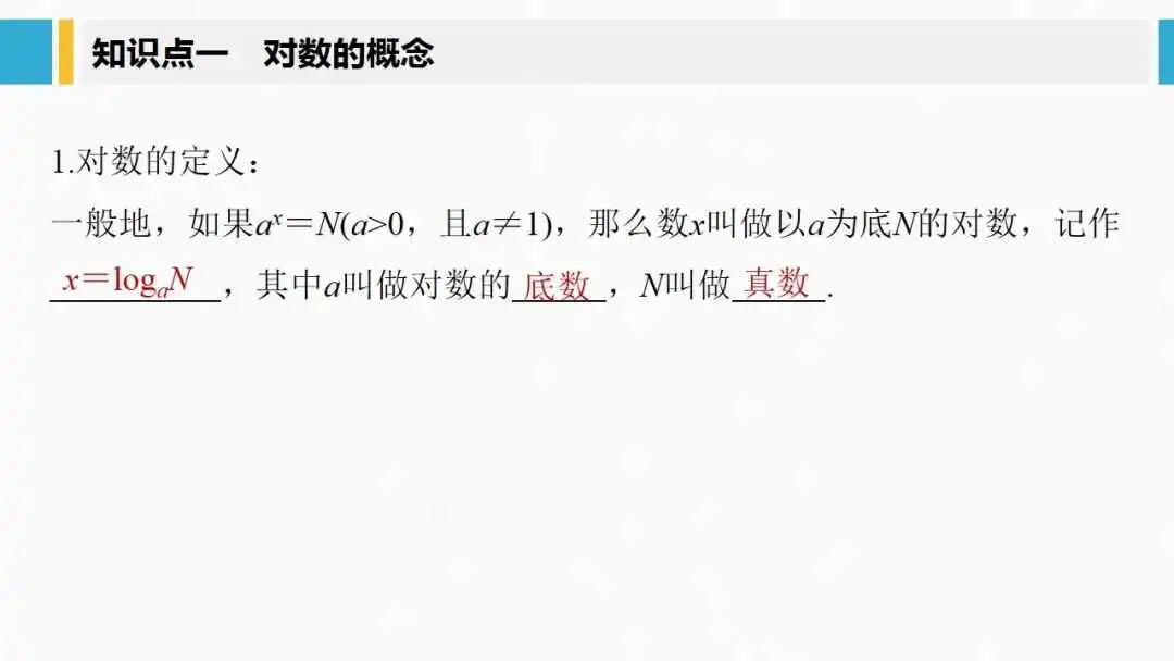 一般地,如果ax=N(a>0,且a≠1),那么数x叫做以a为底N的对数,记作x=logaN,其中a叫做对数的底数,N叫做真数.